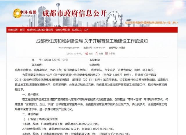 (一)智慧工地平台上线运行。2019年3月20日前,完成“成都市智慧工地平台”(含新建子系统及移动端应用程序)的开发工作,正式上线运行。发布成都市智慧工地设备功能规范及数据接口协议,智慧工地平台上线后,相关协议标准和流程要求请在“成都市住房和城乡建设局”(官方网站)—“网上办事”—“下载中心”查阅和下载。