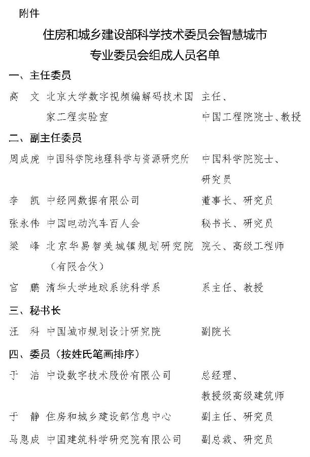为进一步加强住房和城乡建设领域信息化工作,加强对地方智慧城市建设工作的指导,充分发挥专家在城市信息模型(CIM)平台建设和智慧城市建设工作中的作用,根据住房和城乡建设部科学技术委员会相关管理规定,决定成立住房和城乡建设部科学技术委员会智慧城市专业委员会。专业委员会组成人员名单见附件。