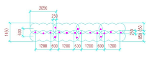 【例】某水泥搅拌墙(图-1),采用三轴搅拌桩施工(图-2),桩径为850mm,桩轴(圆心)矩为600mm,桩长10m,水泥掺量20%,计算该水泥搅拌墙工程量并执行消耗量标准。