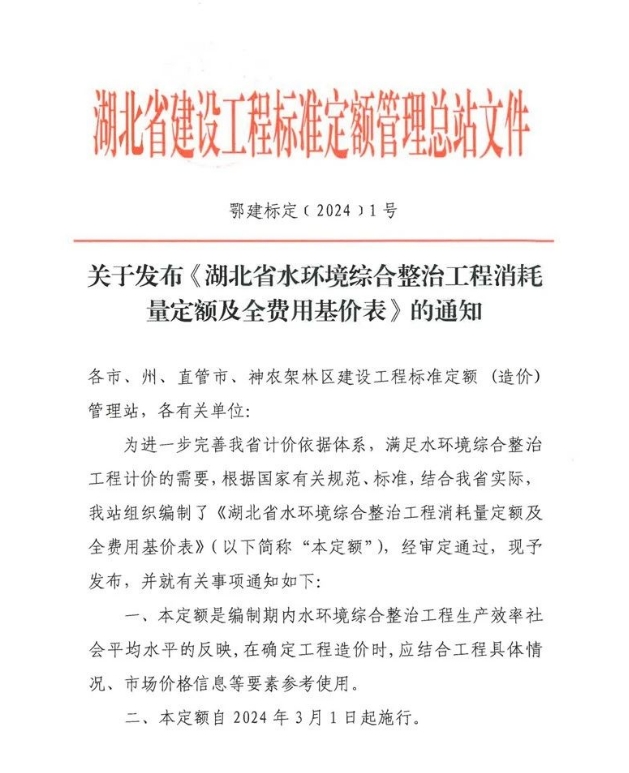 转发湖北省建设工程标准定额管理总站关于发布《湖北省水环境综合整治工程消耗量定额及全费用基价表》的通知