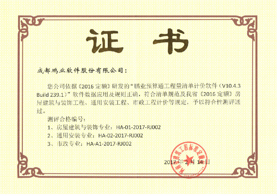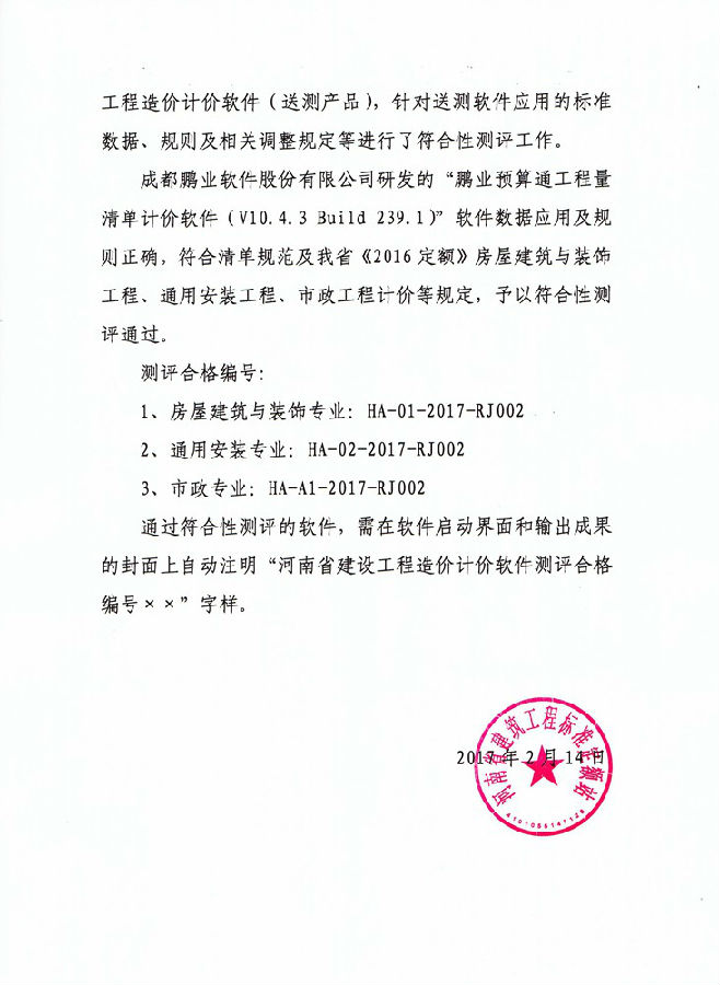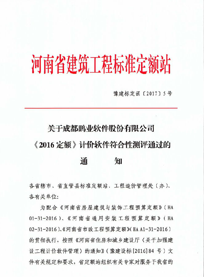 河南省建筑工程标准定额站关于成都鹏业软件股份有限公司《2016定额》计价软件符合性测评通过的通知