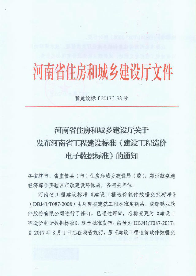 河南省住房和城乡建设厅关于发布河南省工程建设标准《建设工程造价电子数据标准》的通知