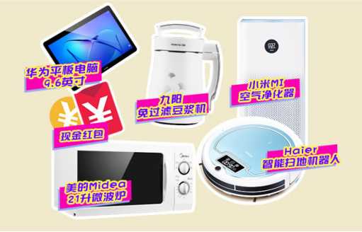 华为平板、小米空气净化器、海尔扫地机器人、美的微波炉、九阳豆浆机、50元现金红包、随机现金红包、300元抵用券等。