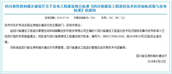 为了建立科学的、全面的、适用的建设工程造价技术经济指标采集与发布体系,实现建设工程造价数据资源的科学积累和有效利用,突破数据积累交换障碍,规范建设工程造价技术经济指标的基础数据采集内容和发布格式,更全面、系统、科学地采集、整理和发布工程造价数据。四川发布工程建设地方标准(四川省建设工程造价技术经济指标采集与发布标准(DBJ51/T096-2018))。