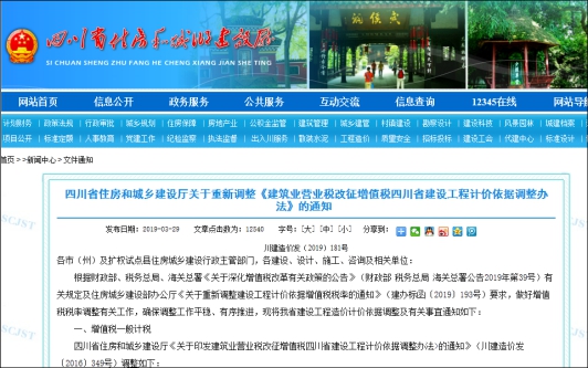 一、川建造价发〔2019〕181号 四川省住房和城乡建设厅关于重新调整《建筑业营业税改征增值税四川省建设工程计价依据调整办法》的通知