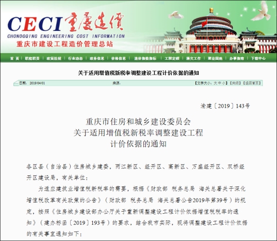 二、渝建〔2019〕143号 重庆市住房和城乡建设委员会关于适用增值税新税率调整建设工程计价依据的通知