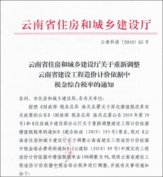 五、云建科函【2019】62号 云南省住房和城乡建设厅关于重新调整云南省建设工程造价计价依据中税金综合税率的通知