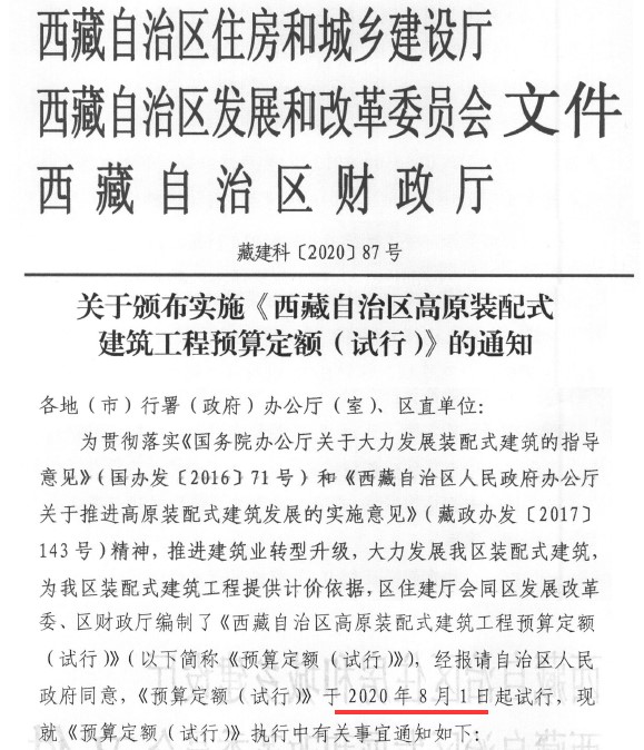 近年来,党中央、国务院高度重视装配式建筑的发展,推进装配式建筑发展是工程建设领域推进生态文明建设、落实绿色循环低碳发展理念的重要举措,是提高工程质量和施工安全水平、提升建筑品质的重要手段,是推动建造方式转变、加快建筑业转型升级的重要途径。西藏自治区住建厅、发改委、财政厅联合发布“藏建科〔2020〕87号关于颁布实施《西藏自治区高原装配式建筑工程预算定额(试行)》的通知”,高原装配式预算定额将于8月1日起执行,为西藏地区装配式建筑提供计价依据。
