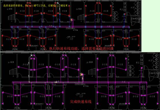 快速布线:设置好起点后,批量选择需要布线的回路后,软件一次性将所有选择的回路进行桥架布线