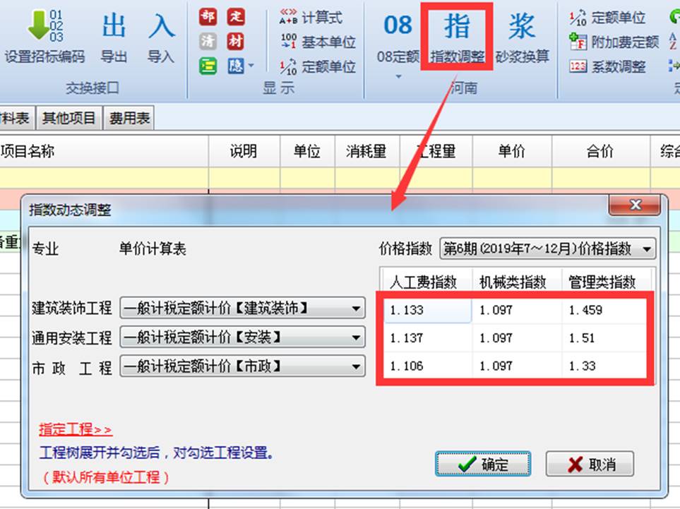 软件里,将定额子目套完后,点“指”按钮弹出指数动态调整窗口,在右上角默认为最新一期的价格指数(也可以选择其他期的价格指数),价格指数的期确定后,点确定按钮可对整个项目的所有单位工程里的所有2016定额的指数进行调整。