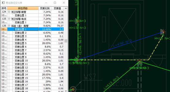 管线变更表,列出所有计算最短路径的项目、变更比例和变更值,具体到各个位置,可定位到图形(图中虚线表示原来管线路径);