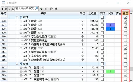 开启最短路径功能后,工程量表中项目对应的直连选项可对单个项目开启或关闭最短路径;