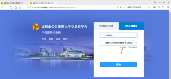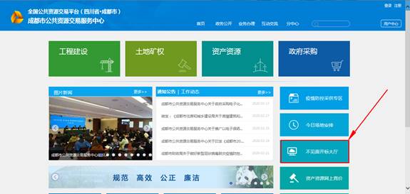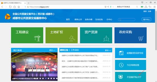 登录成都市公共资源交易服务中心网站(www.cdggzy.com),点击首页的“不见面开标大厅”功能模块,登录到不见面系统中: