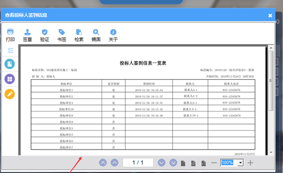 开标人员点击下方【查看投标人签到信息】,展示投标人签到信息一览表。