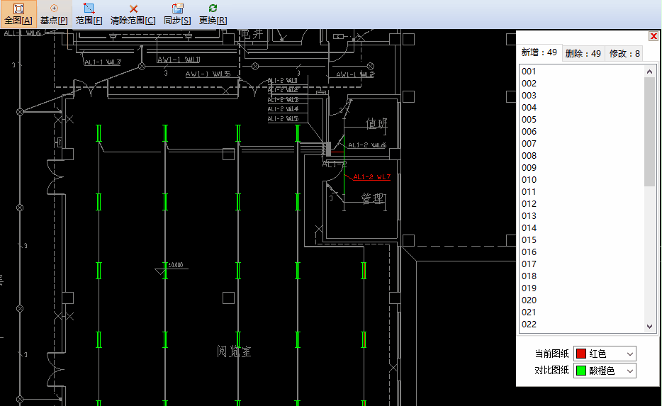 将选择图纸与当前图纸进行重叠对比,根据颜色快速区别两张图纸的不同之处,并形成差异列表可供定位