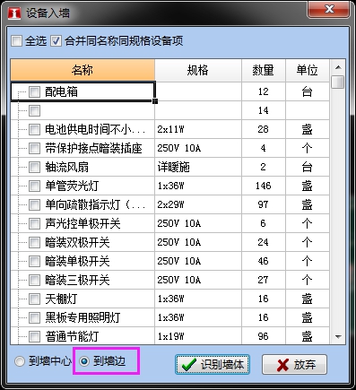 执行设备入墙功能时,可选择设备入墙的位置(到墙中心或到墙边)。