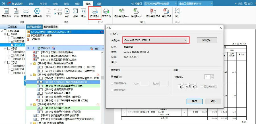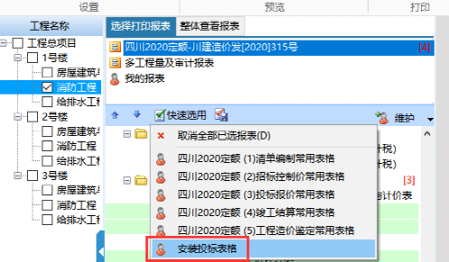 报表里可以自主设置常用的报表组,方便进行快速选用,当然软件也内设了一些招投标的常用表格,可以直接进行选用。