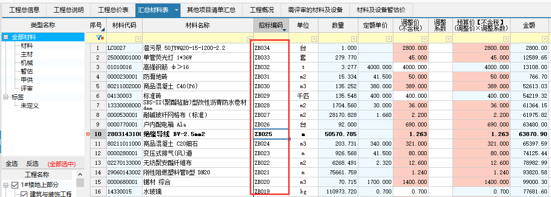 当招标文件有相应的评审材料、暂估材料时,需要在单位工程里面去响应招标文件要求。并且在软件中工程项目层级把招标的需评审的材料及设备、材料及暂估价全部显示,方便进行匹配和招标编码响应。