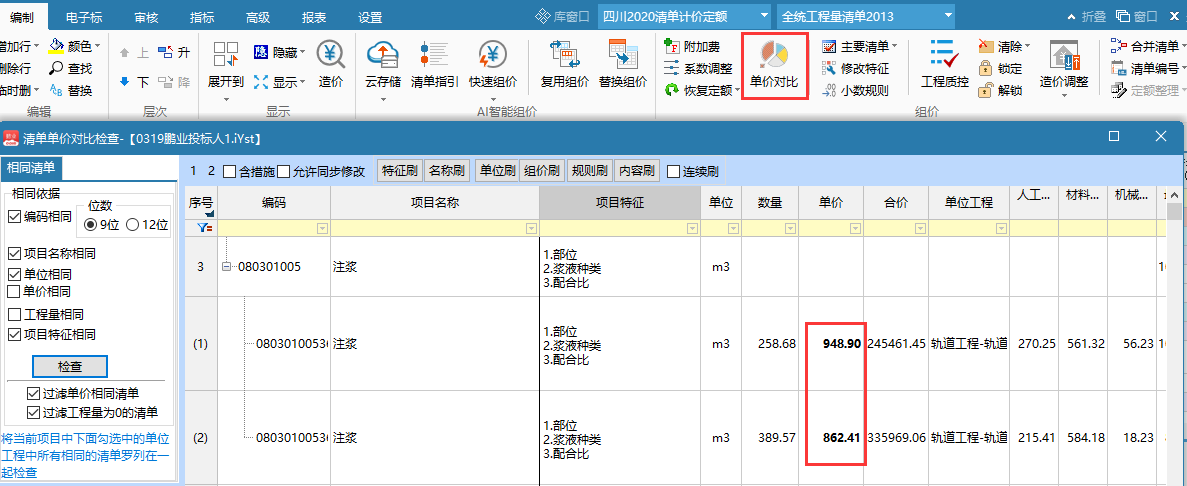 工程编制完成后,通过单价对比功能快速对相同的清单存在不同的单价进行筛选,方便快速调整。